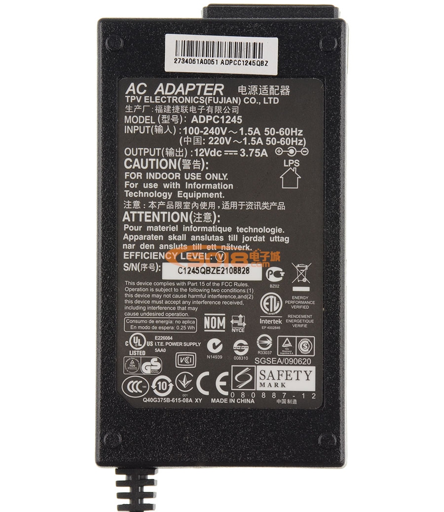 二、產品參數:INPUT/輸入:100-240V 1.5A 50-60HzOUTPUT/輸出:12V-3.75A 輸出接口:DC插頭(5.5mm/2.5mm)輸出線長:約1.5米