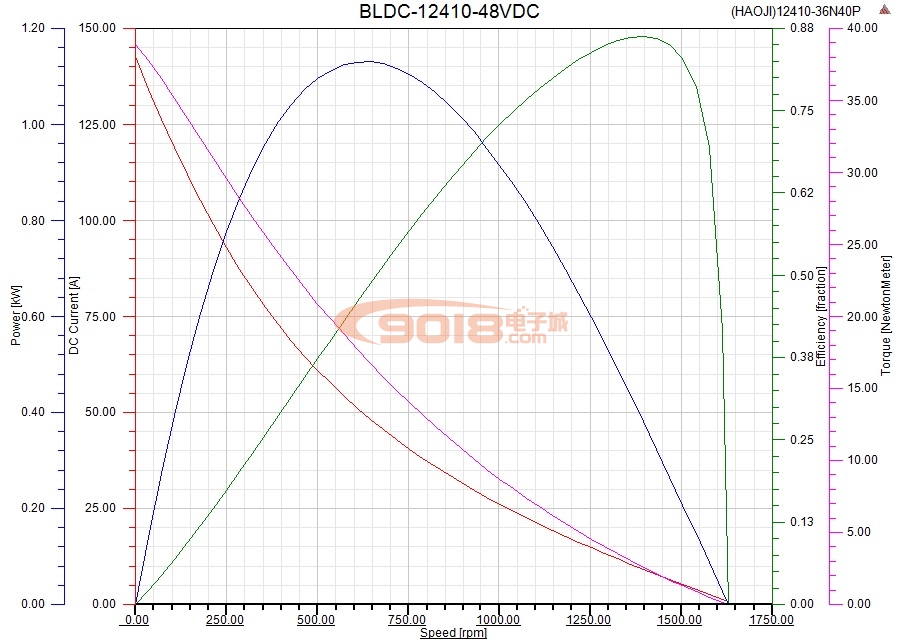 上述電氣參數(shù)系經特定條件下實測獲得后導入RMxprt模型進行仿真計算得出的結果,未將驅動器損耗、軸承阻尼及磨擦、風阻等因素考慮在內,與實際測試值可能會有所偏差,僅供參考。無刷電機的工作電壓范圍較廣,電壓不同,其額定轉速(可長期負載工作點)也是不同的。轉速與電壓成正比,轉矩與電流也大致成正比,自然散熱條件下,額定最大轉矩不超過3.3Nm,額定最大電流不應超過11.5A,電機在低轉速區(qū)間(300轉以下)轉子風冷效果較差,電樞繞組換相頻率較低,導致電機溫升有所增加,此時應適當降低電機電流或采取積極的降溫措施。以上是電壓與轉速、電流與轉矩的關系,簡單來說,電機在某個特定電壓下,會有一個最大的合適的可持續(xù)運行的轉矩,此轉矩稱為失速轉矩(也稱額定轉矩),即由空載到負載時電機最低的一個下限轉速(額定轉速),在此轉速下對外輸出的轉矩就是失速轉矩,經驗表明,此下限轉速通常為空載轉速的82%-88%時效率最高,電機發(fā)熱少,但輸出轉矩偏小,如果想增加扭矩或者轉速,可適當增加電壓也就是增加電流來達到目的,同時電機溫升增加,只要電機溫度(繞組、軸承)不超80度,或者加強散熱(如加散熱風扇)控制電機溫升,電機是相對安全的。故用戶在做電機選型時,應根據(jù)自己的需要(轉速\轉矩)來選擇合適功率的電機,避免電機過載燒毀或者功率余量過大出現(xiàn)大馬拉小車的浪費。綜上所述,本店已如實告知用戶使用此產品可能存在的風險與使用相關知識,一旦售出非質量原因概不予退換貨,不提供免費售后質保,購前務必知悉。
