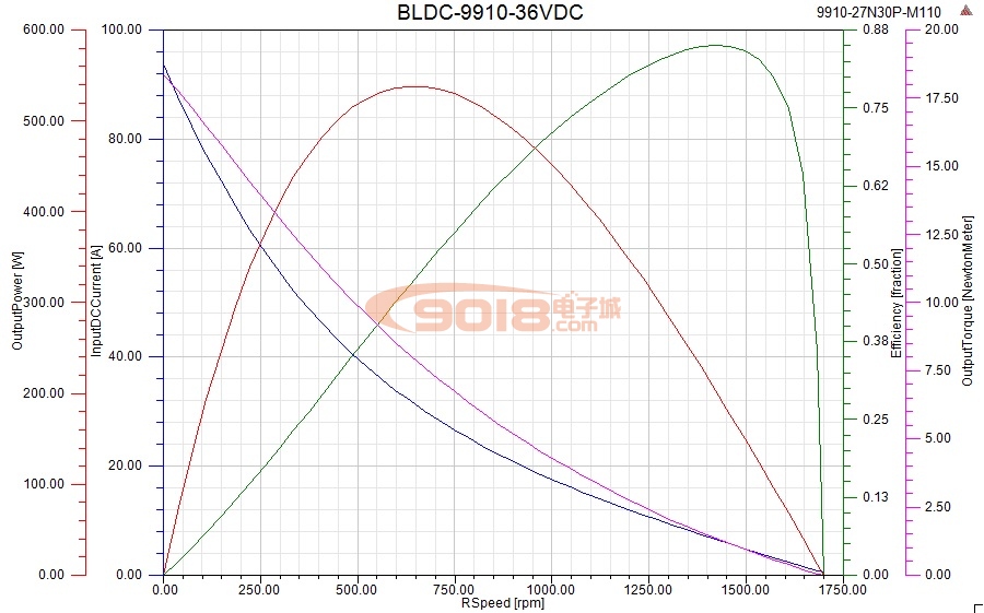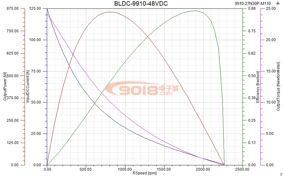 上述電氣參數系經特定條件下實測獲得后導入RMxprt模型進行仿真計算得出的結果,未將驅動器損耗、軸承阻尼及磨擦、風阻等因素考慮在內,與實際測試值可能會有所偏差,僅供參考。無刷電機的工作電壓范圍較廣,電壓不同,其額定輸出功率及效率也是不同的。經計算,電壓和轉速越高,其功率和效率也相對較高,這也是本電機以較小的尺寸輸出大功率的原因。特別注意的是,雖然電機的“輸出功率"=“轉速*轉矩”,但不能簡單機械地換算為“同等功率"下,轉速越低,扭矩越大,經常有用戶要求盡可能地把電機的轉速做低,這樣扭矩不就上去了嗎?把電機的轉速常數(KV)做低,相同電流密度的情況下扭矩確實有所增加,但效率下降,溫升增加。電機的扭矩與其物理尺寸有關,增加電機的物理尺寸才能裝進更多的銅線和更大的永磁體,而不是靠強行增加電流密度來過載使用,否則繞組很快就因過熱而燒毀。同樣厚度同等功率的情況下,大直徑電機比小直徑電機扭矩更大轉速更低,功率不是電機選型的主要參數,而應根據所驅動的負載轉速、轉矩來選擇相匹配的電機,以避免電機選型錯誤導致電機過載燒毀或者功率余量過大出現浪費。