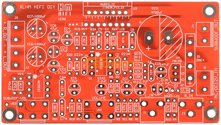 套件PCB使用優質雙面玻纖板,高級紅油阻焊層,布局合理,美觀大方。外圍元件少,無噪音,低音低沉有力,中高音飽滿清晰,音質純凈。適合于汽車、摩托車、電動車及多媒體音響的改裝,提升您的音響音質。