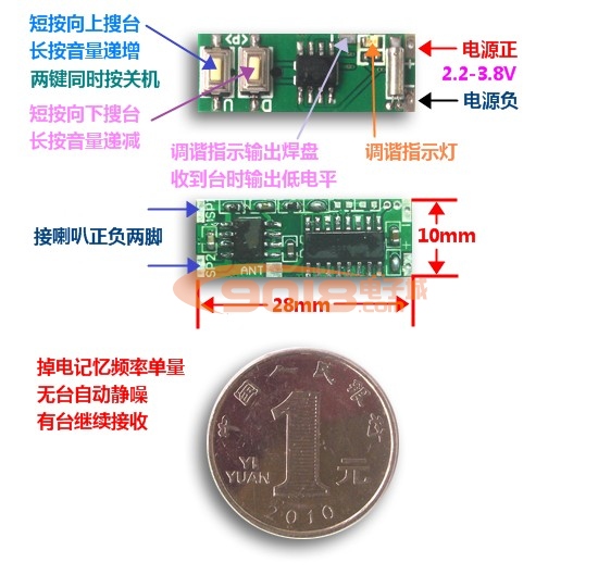 高集成接收IC,全部為貼片元件,超小型單片機控制,性能更穩定,絕無頻漂,體積小巧,功能強大,使用方便,適用于各類微型接收場合。