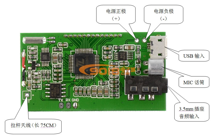 ANT端口用來(lái)連接FM天線,為了更好的發(fā)射FM信號(hào),建議外接75cm長(zhǎng)度的拉桿天線,并且天線附近盡可能的沒有障礙物遮擋。