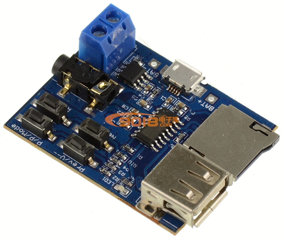 2) 支持U盤(測試過32G),TF卡(測試過16G)播放模式;上電默認TF卡模式,若TF卡不存在自動跳到U盤模式,而且兩種設備都有安裝,可以手動設置播放模式,詳情請看按鍵操作說明。