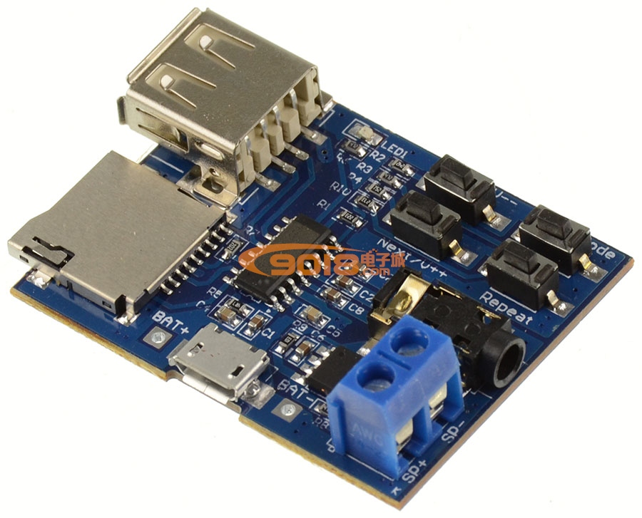1) 支持MP3格式,上電自動播放,播放狀態時紅色LED指示燈更新。