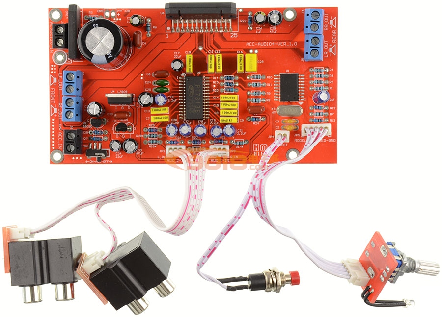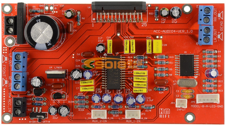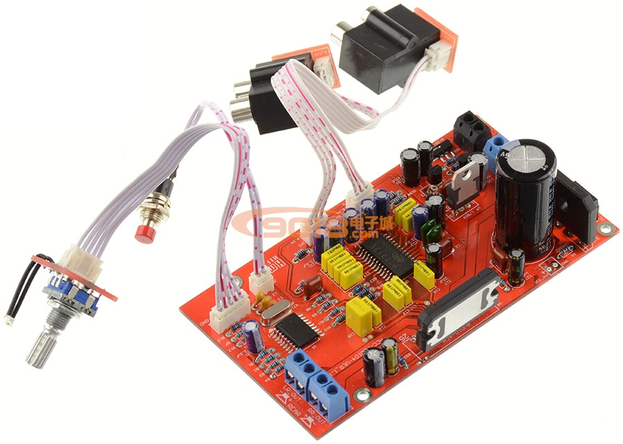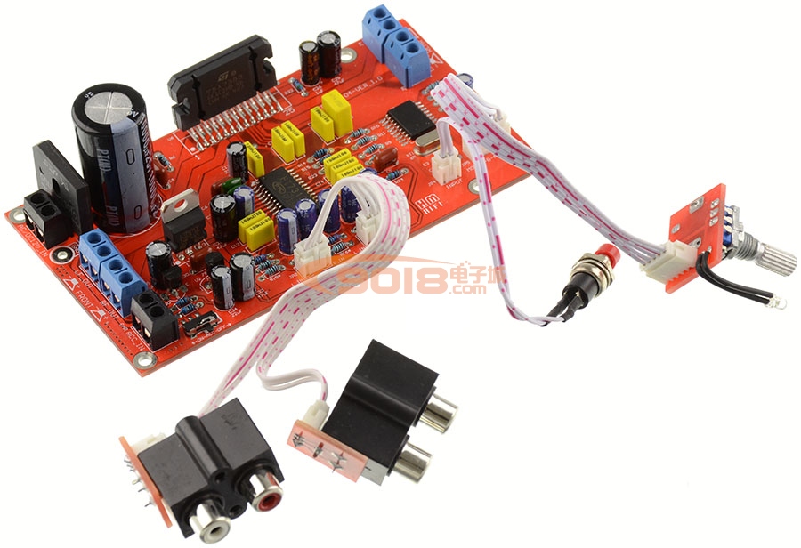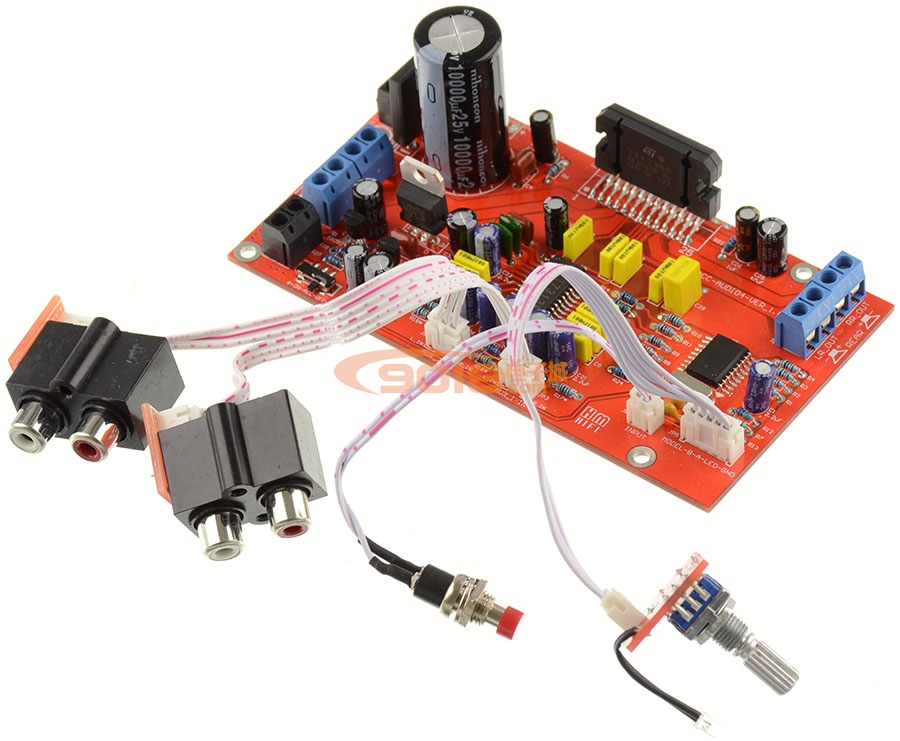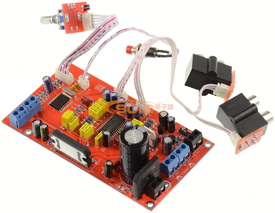 本板采用原裝意法半導體(ST品牌)的TDA7388音頻功放IC,音色優美,Hi-Fi級四聲道輸出。TDA7388采用MOSFET放大,具有失真小,低噪音,抗干擾能力強等優點,BTL四聲道輸出,最大輸出功率可達4 x 41W 。本電路使用一顆單片機(CPU)來控制音效,與廣范應用在車載影音,液晶電視等產品中的電子音量集成電路(PTC品牌) PT7313負責音量及音效處理,整體音效低沉有力,中高音清晰分明,音質極佳。用一顆帶輕觸按鍵的編碼器選擇并調節:高音/低音及總音量,帶兩路外接音頻信號輸入,由一個輕觸按鍵通過CPU控制:AUX_1和AUX_2的輸入選擇(比如:AUX_1連接DVD音源,AUX_2連接電腦或MP3音源,通過選擇按鍵就可以輕松轉換音源信號的輸入,不用拔插連接線)。實現兩路音源輸入,操作非常簡便。帶斷電記憶功能,記憶斷電前的總音量。特別適合汽車音響升級或DIY四聲道家庭影院功放,該電路工廠一直在量產的成熟方案。是愛好DIY朋友的選擇。
