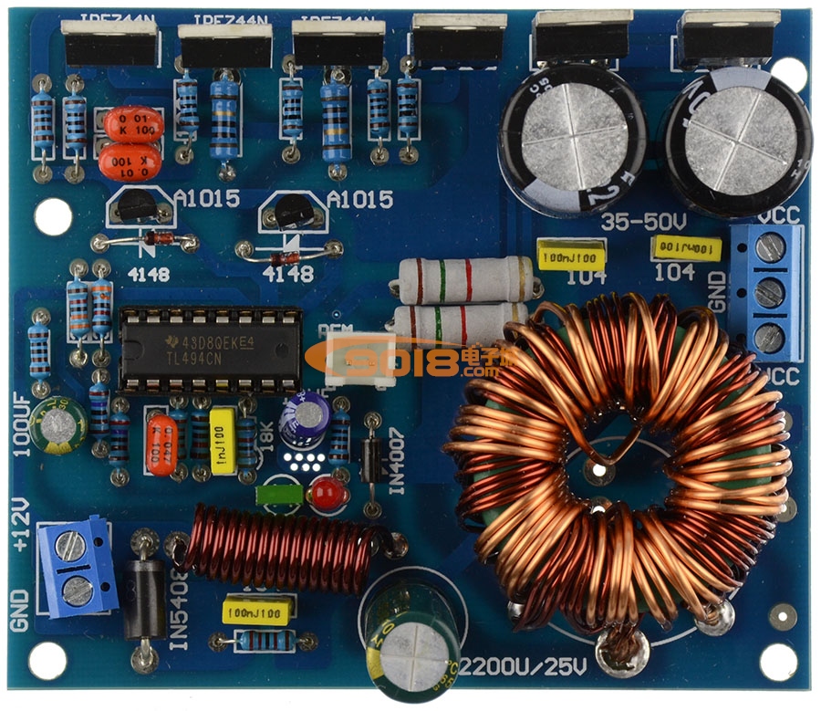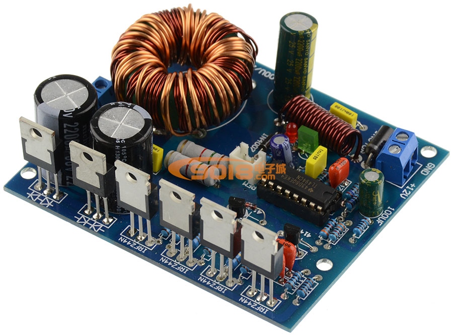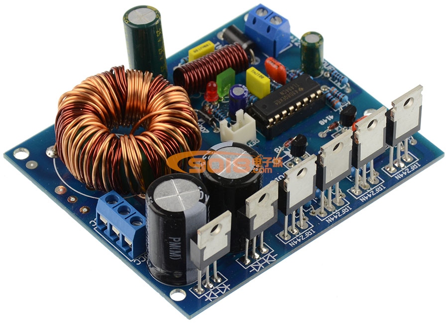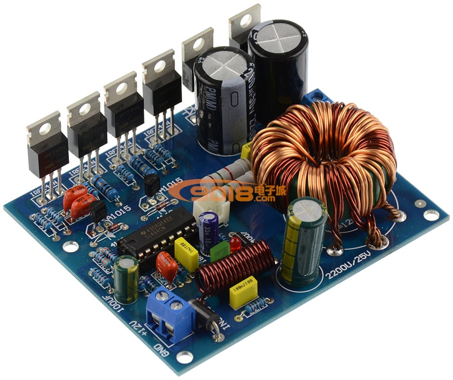特別注意:板子到手后,請不要立即裝上散熱器及連接設備使用,也不要連接電瓶等這種大電流大功率電源,應當接上直流12V1A左右小功率電源適配器,一旦極性接反也不致于燒壞板子。請保持空載狀態,用萬用表測試輸出電壓是否正常,并且正反電壓一致即說明板子無質量問題。然后,就可以安裝散熱器了,必須在6只功率管和散熱器之間加上絕緣墊圈,否則也會燒板。