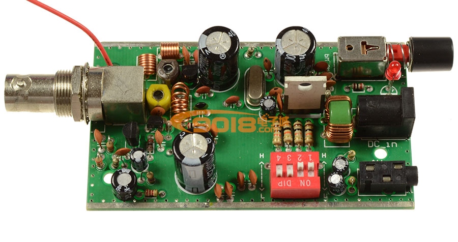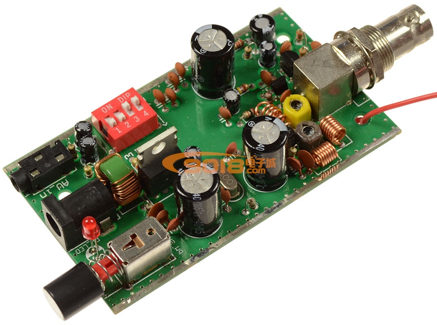該發(fā)射板采用精制雙面板,發(fā)射板的外形尺寸為44x82mm, 工作電壓9-12V,高頻電路采用鎖相環(huán)調(diào)頻立體聲發(fā)射集成電路BH1416F,工作頻率相當(dāng)穩(wěn)定,不因人體感應(yīng)而產(chǎn)生頻率飄移,工作頻率由 撥碼開關(guān)控制,共有低端76.8,77.0,77.2,77.4,77.6,77.8,78.0七個頻率可選或高端88.0,88.2,88.4,88.6,88.8,89.0,89.2七個頻率可選,采用1.1米的拉桿天線其參考發(fā)射距離在開闊地帶約10至100米。