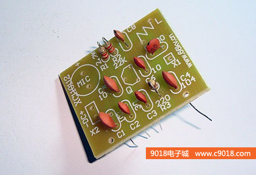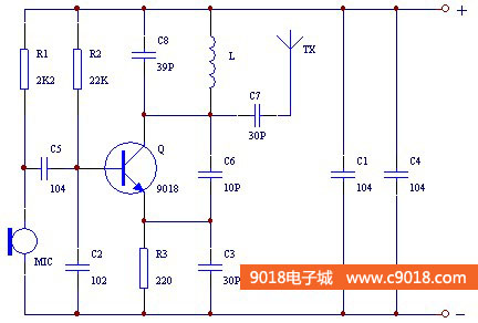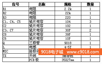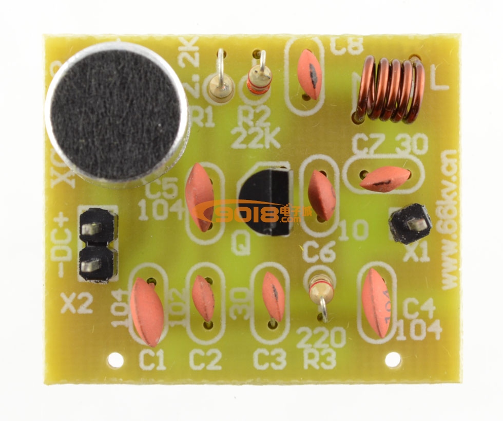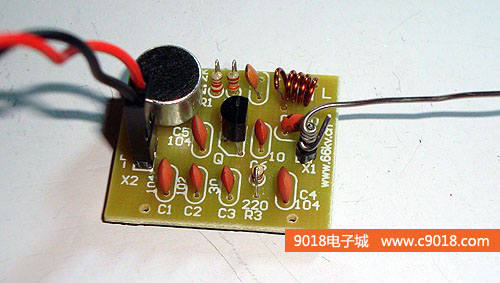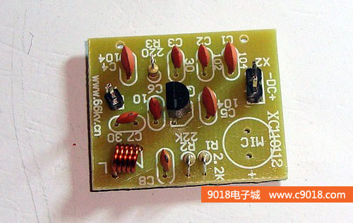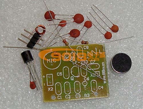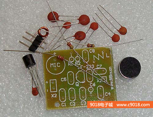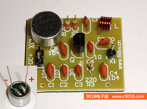 MIC是駐極體話筒,它的作用就是感應(yīng)空氣中聲波的微弱振動(dòng),并輸出跟聲音變化規(guī)律一樣的電信號(hào)。本站選用的是靈敏度較高的話筒,一般可以輸出幾十毫伏以上的音頻信號(hào),這個(gè)信號(hào)足以調(diào)制下一級(jí)的高頻振蕩信號(hào)的頻率。注意:話筒有正負(fù)極之分,一般和外殼相通的是負(fù)極。