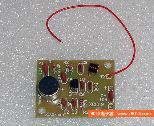 C7是高頻信號(hào)輸出耦合電容,目的是為了讓高頻信號(hào)變成無線電波幅射到天空中。因此,天線最好堅(jiān)直向上,長度最好等于無線電波頻率波長(或者整數(shù)倍),四周應(yīng)該開闊,不要有金屬物阻擋。說明:波長等于頻率的倒數(shù),頻率變化,波長也會(huì)變化,再說,天線具體的長度還與電路輸出阻抗、天線粗細(xì)等等有關(guān),在業(yè)余情況下,隨便接一段電線就行了。(如果為了追求最遠(yuǎn)的發(fā)射距離,大家可以自行多做這方面的嘗試,本站元件包經(jīng)過本站技術(shù)人員試驗(yàn),效果是可以輕松達(dá)到50米以外的。)