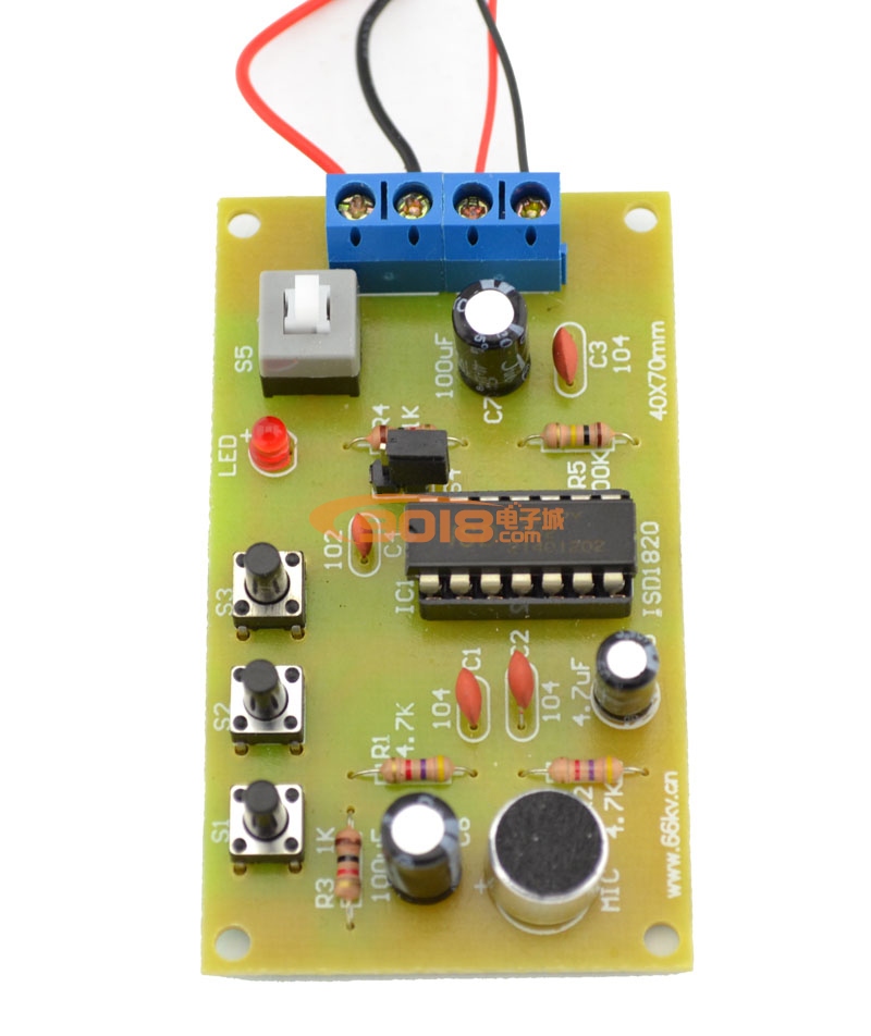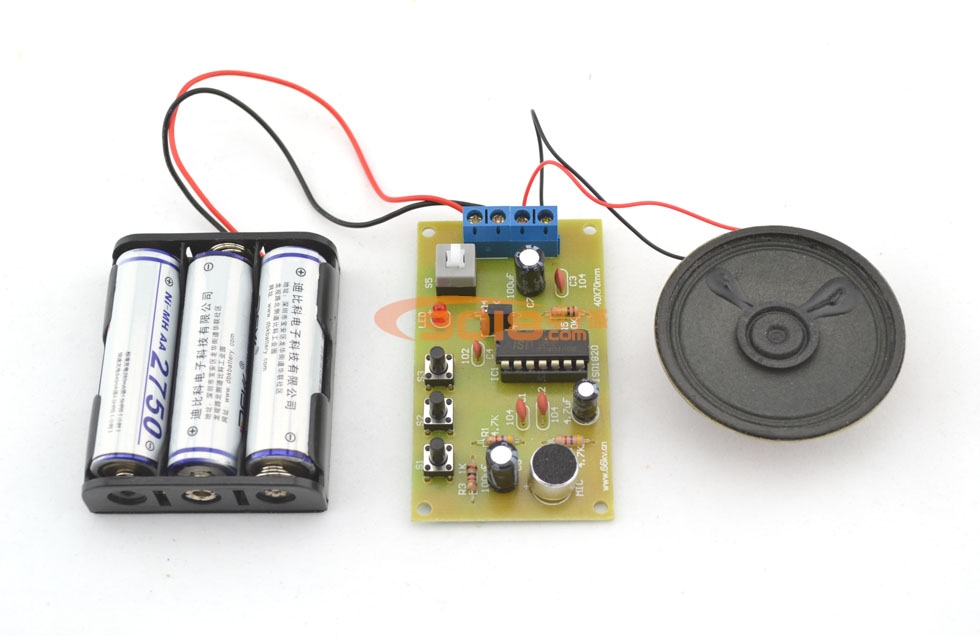 接通3-5V電源后,按住錄音按鈕S3,指示燈LED會點亮,錄音在10秒后或松開S3時停止;放音有三種情況:1、邊沿觸發放音,按S2一下,即將全段錄音放出,2、電平觸發放音,按住S1時放音,松開即停,3、循環放音,閉合S4(就是把短路帽插在兩根插針上)按S2一下開始循環放音,只有斷電才停止。