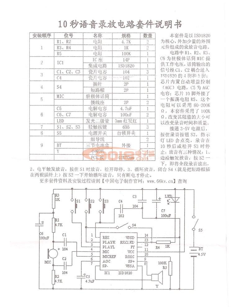 本套件是以ISD1820為核心,外加少量的外圍元件組成的錄放音電路。