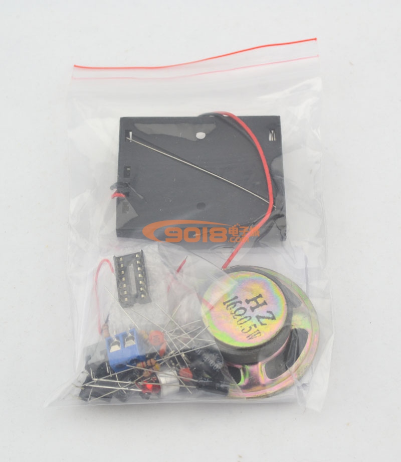 電路中R1、R2、R3、C6為駐極體話筒MIC提供工作電壓,話筒輸出的信號經C1、C2耦合進入ISD1820的4腳和5腳;芯片內置自動增益控制(AGC)電路,C5為AGC電容;芯片10腳外接了一個振蕩電阻R5,這個電阻可以采用80-200KΩ,本套件采用了100KΩ,改變其阻值的大小可以改變錄音時間和質量,比如這個電阻為200KΩ時,錄音時間為20秒。