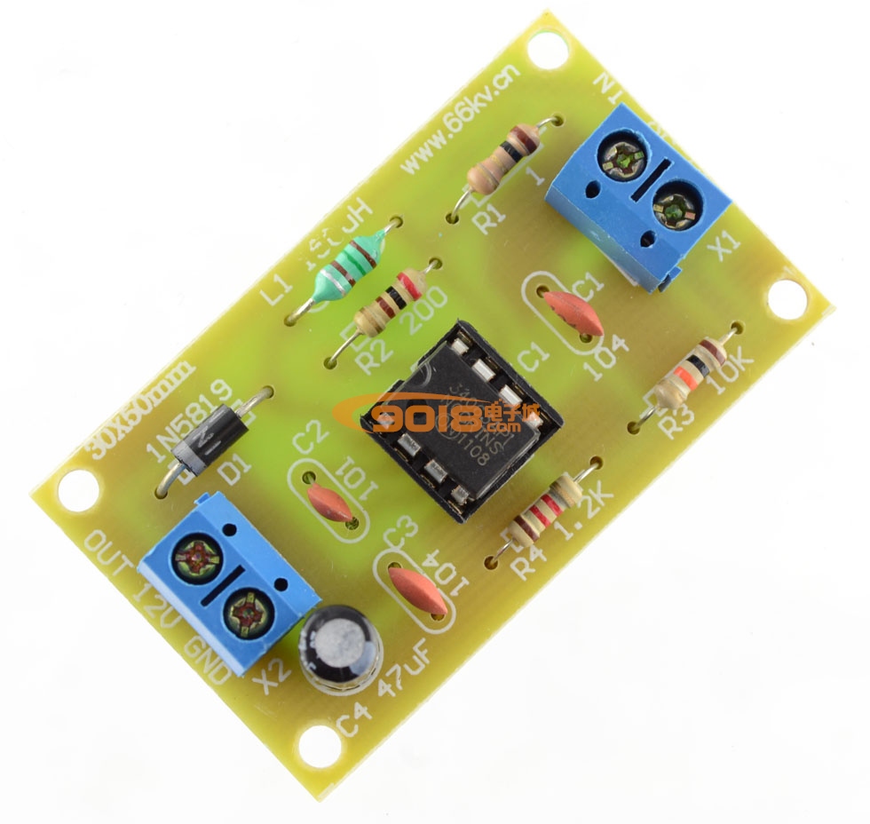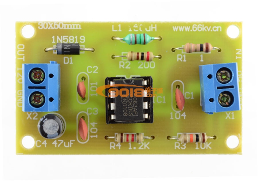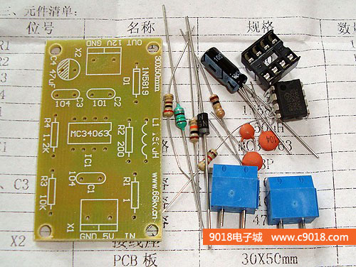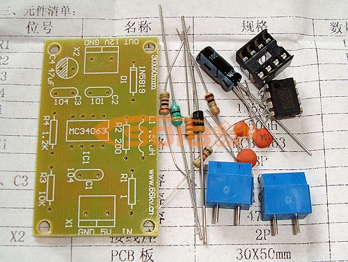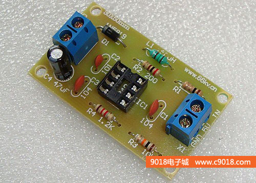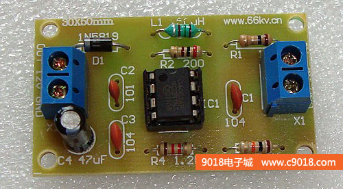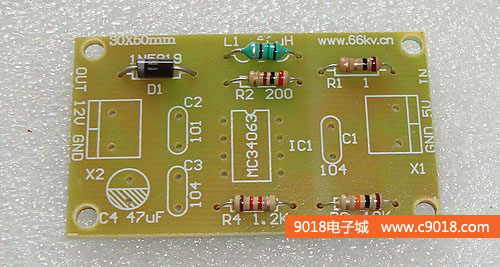 當芯片內開關管(Q1)導通時,電源經取樣電阻R1、電感L1、MC34063的1腳和2腳接地,此時電感L1開始存儲能量,而由C4對負載提供能量。當Q1斷開時,電源和電感同時給負載和電容C4提供能量。電感在釋放能量期間,由于其兩端的電動勢極性與電源極性相同,相當于兩個電源串聯,因而負載上得到的電壓高于電源電壓。開關管導通與關斷的頻率稱為芯片的工作頻率。只要此頻率相對負載的時間常數足夠高,負載上便可獲得連續的直流電壓。
