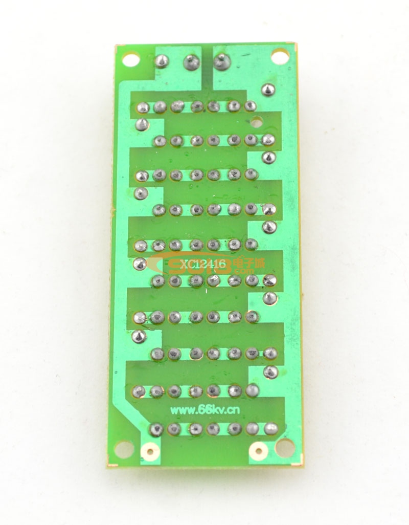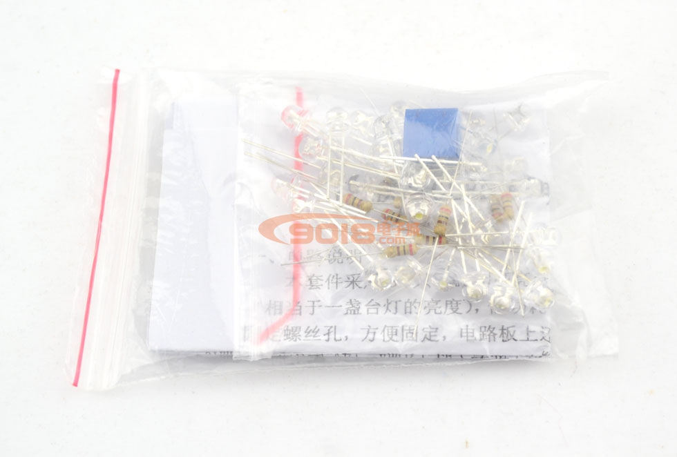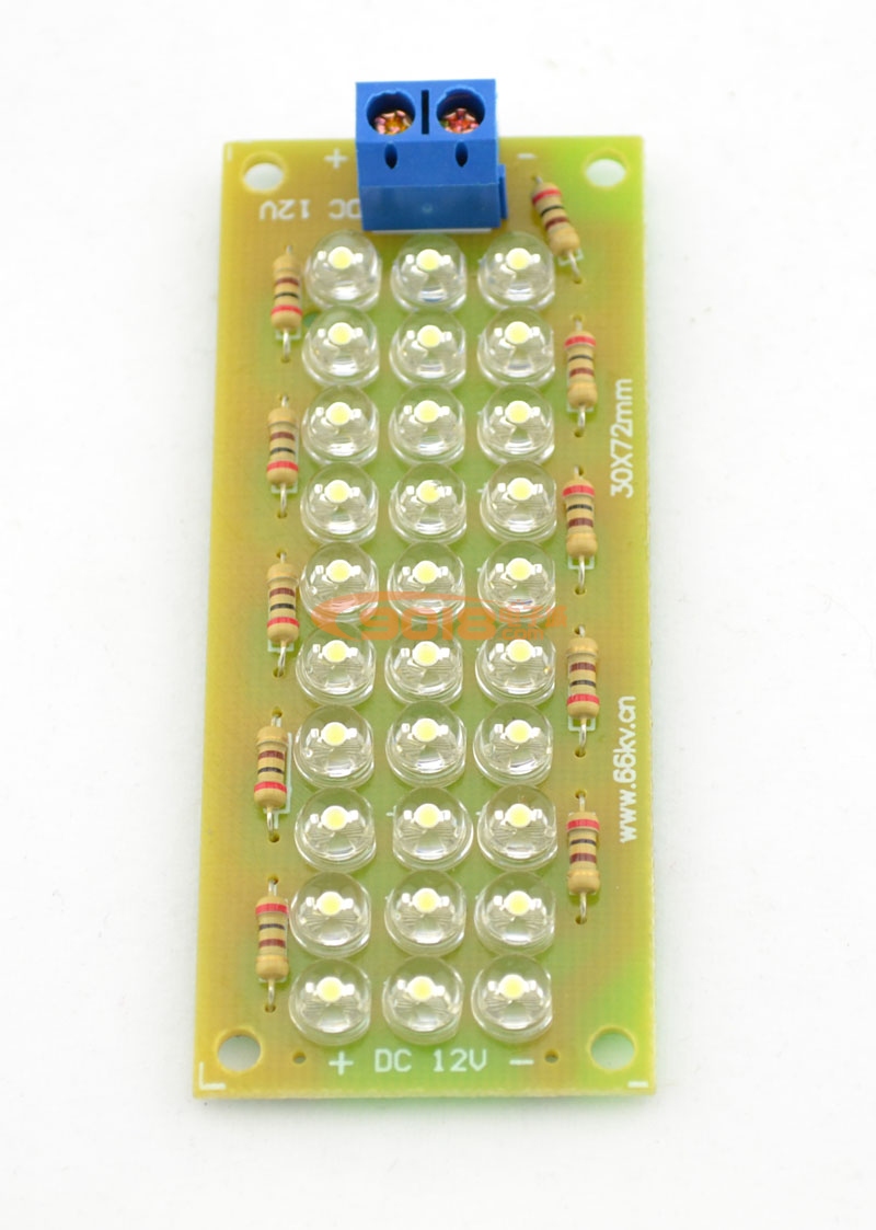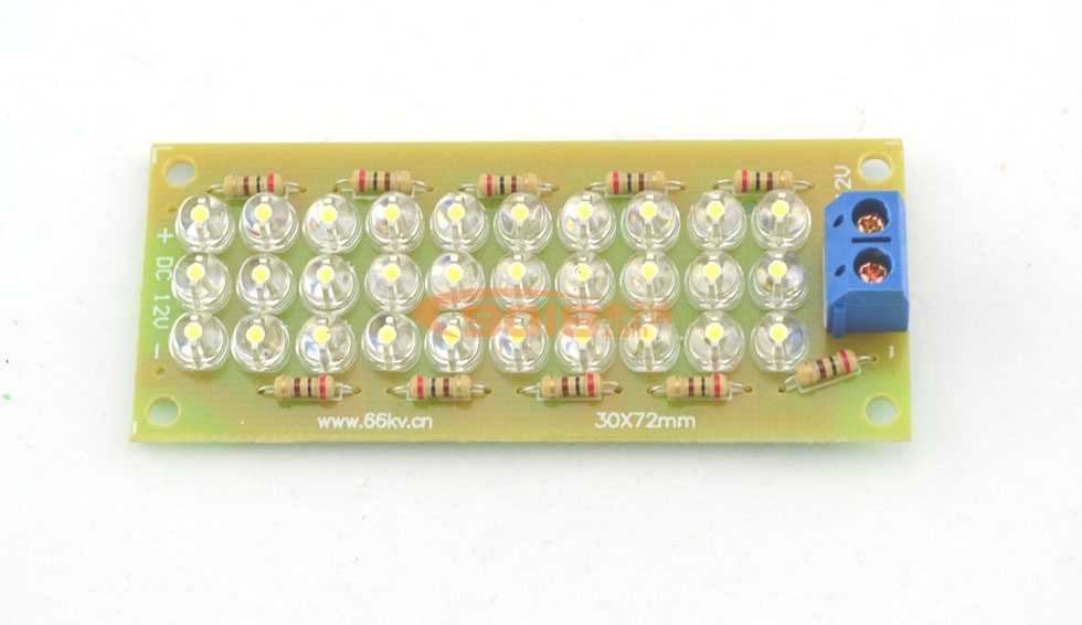 本套件采用30只5mm正白色超高亮度草帽LED和10只限流電阻組成,高亮度(相當于一盞臺燈的亮度),低功耗(12V供電時僅1.6W),電路板四周帶3mm固定螺絲孔,方便固定,電路板上還有電源接線端子。電源電壓:DC10-14V,工作電流約10V供電時60mA、12V供電(推薦)時130mA、14V供電時200mA。朋友們可以根據自己的需要購買多塊并聯使用,以達到自己需要的亮度。如果采用24V、36V、48V供電時,可以多塊串聯使用。