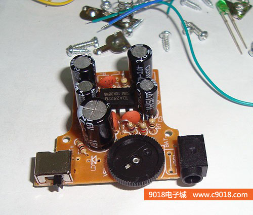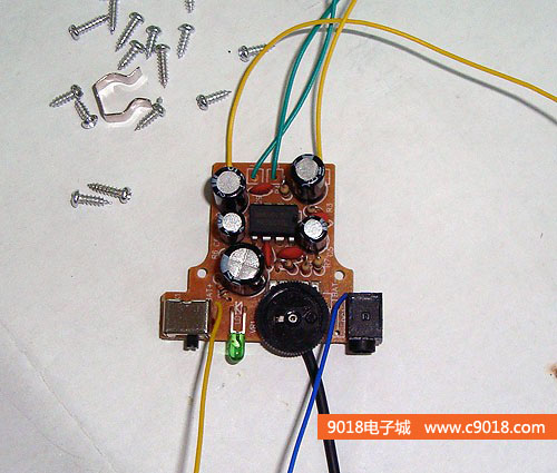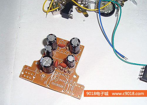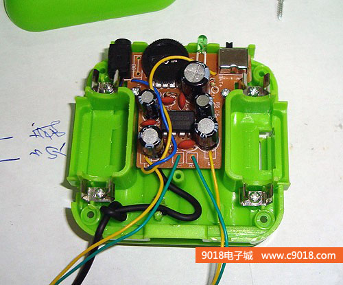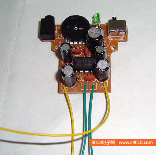 9、再焊上信號輸入線,金色的焊在公共端上,紅色和藍色線分別接在兩個聲道的輸入端