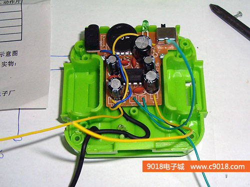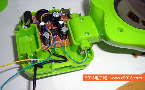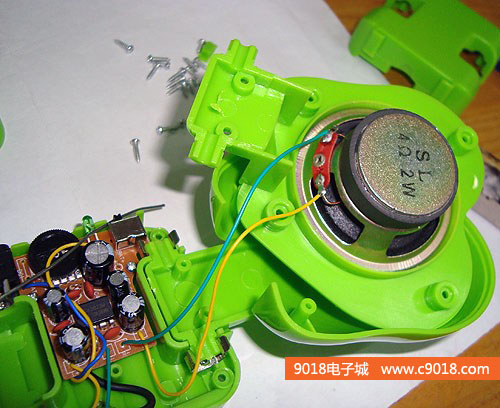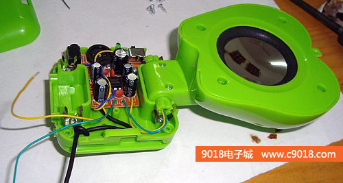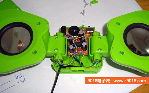 15、裝喇叭和音箱,喇叭裝在音箱上用膠粘牢,再焊上喇叭線