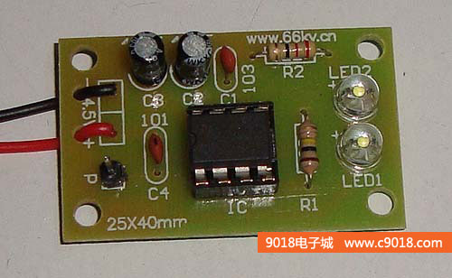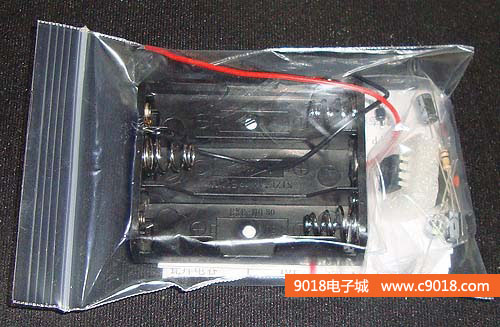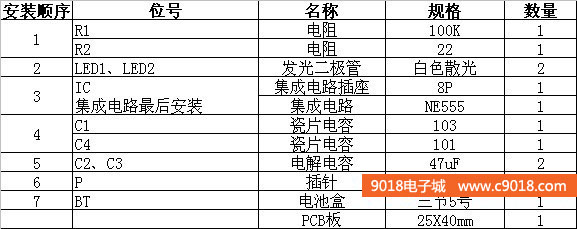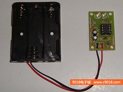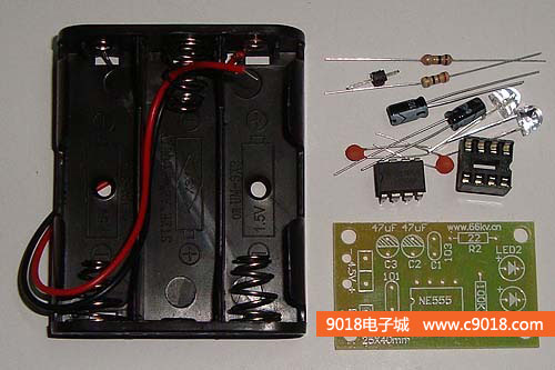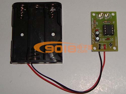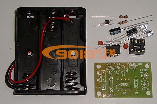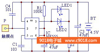 本套件是NE555單穩態觸發器的一個應用電路,電路平時處于復位狀態,LED不亮。當P受到觸摸時,電路被觸發進人暫態,3腳輸出高電平,LED被點亮。經過一段時間后,暫態結束,電路翻轉成穩態,3腳輸出低電平,LED熄滅。暫態時間t=1.1R1 X C2。電路采用4.5V直流供電,套件中配有三節5號電池盒。