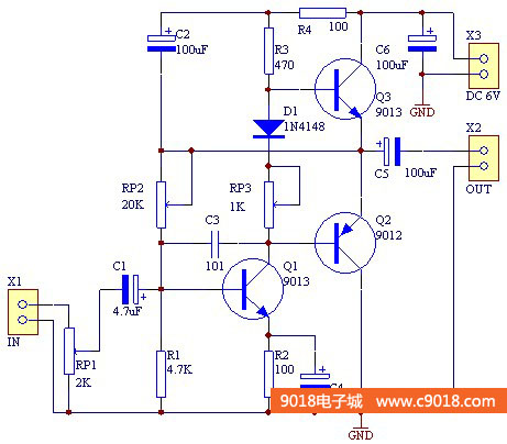 Q1是激勵放大管,它給功率放大輸出級以足夠的推動信號;R1、RP2是Q1的偏置電阻;R3、D1、RP3串聯在Q1集電極電路上,為Q3提供偏置,使其靜態時處于微導通狀態,以消除交越失真;C3為消振電容,用于消除電路可能產生的自激;Q2、Q3是互補對稱推挽功率放大管,組成功率放大輸出級;C2、R4組成“自舉電路”,R4為限流電阻。