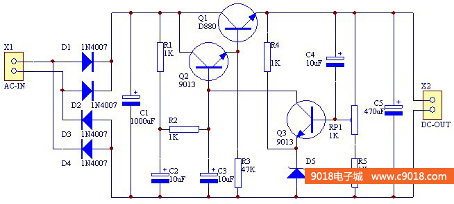 Q1、Q2組成復(fù)合調(diào)整管,Q1是大功率管與負(fù)載串聯(lián),用于調(diào)整輸出電壓,R1、R2為復(fù)合管的偏置電阻,C2、C3用于減小紋波電壓,R3為復(fù)合管反相穿透電流提供通路,防止溫度升高時(shí)失控;Q3為比較放大管,它是將穩(wěn)壓電路輸出電壓的變化量放大送至復(fù)合調(diào)整管,控制其基極電流,從而控制Q1的導(dǎo)通程度;D5為Q3的發(fā)射極提供穩(wěn)定的基準(zhǔn)電壓,R4保證D5有合適的工作電流,C4為加速電容,用于誤差電壓濾波;RP1、R5組成輸出電壓的取樣電路,將其變化量的一部分送入Q3基極,調(diào)節(jié)RP1可調(diào)節(jié)輸出電壓的大小。