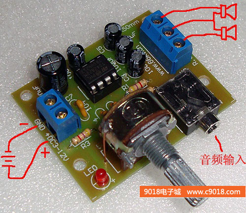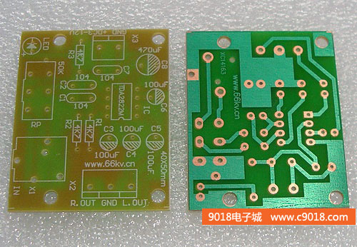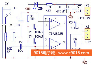 電路中X1是音頻輸入端,采用的是優(yōu)質(zhì)3.5mm雙聲道音頻插座;X2是雙聲道音頻輸出端,外接兩只喇叭或音箱;X3是直流電源輸入端,本套件采用直流3-12V供電,如果采用交流供電需要外加整流電路,RP是音量調(diào)節(jié)電位器,為了減少干擾,電位器外殼需要接地;C1(C2)是輸入耦合電容,C5(C6)是輸出耦合電容,C3(C4)是負(fù)反饋電容。