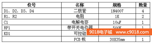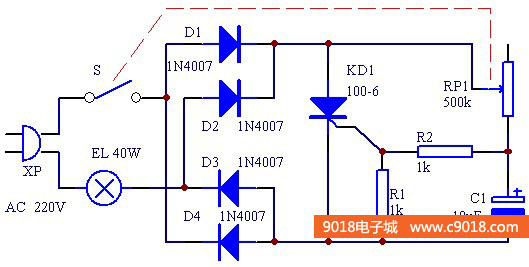 電路中,由電源插頭XP、燈泡EL、電源開關S、整流管D1~D4、單相可控硅KD1與電源構成主電路;由電位器RP1、電容C1、電阻R1與R2構成觸發電路。將XP插入市電插座,閉合S,接通220V交流電源,D1~D4全橋整流得到脈動直流電壓加至RP1,調節RP1的阻值,就能改變C1的充/放電時間常數,即改變KD1控制觸發角,從而改變KD1的導通程度,使EL獲得0~220V電壓。RP1的阻值調得越大,則EL越暗,反之越亮,達到無級調光的目的。