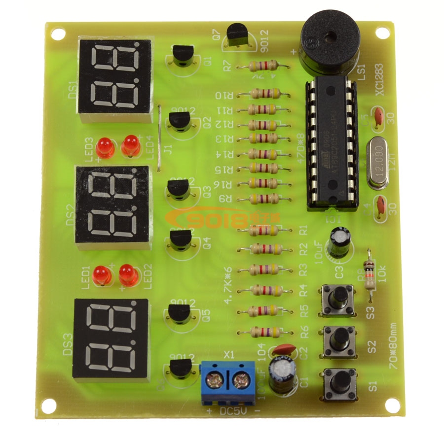 4、倒計時功能:短按三次S1,顯示狀態為 0,冒號為長滅。按動S2則從低位依此顯示高位,按動S3則相應位加1,當S2按到第6次時會在所設定的時間狀態下開始倒計時,再次按動S2將再次進入調整功能,并且停止倒計時。