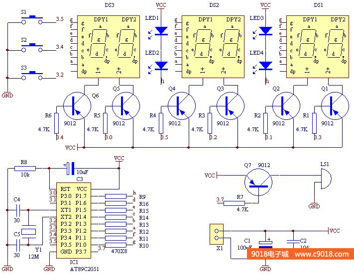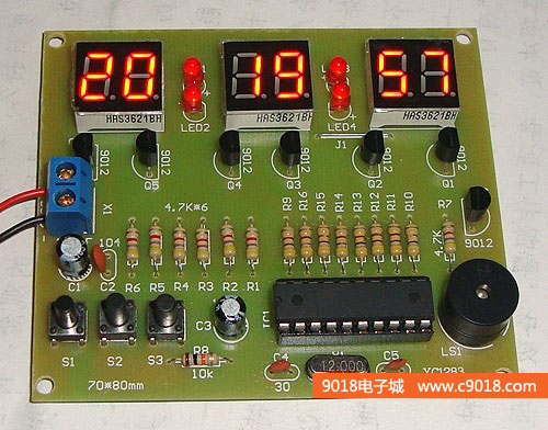 本套件以AT89C2051為核心器件,并配合所有的必須的電路,只具有上電復位的功能。顯示部分主要器件為2位共陽紅色數碼管,驅動采用 PNP 型三極管驅動,各端口配有限流電阻,驅動方式為掃描,占用 P1.0~P1.6 端口。冒號部分采用4個3mm的紅色發光二極管,驅動方式為獨立端口驅動,占用P1.7端口。按鍵 S1~S3 采用復用的方式與顯示部分的 P3.5、P3.4、P3.2 口復用。其工作方式為,在相應端口輸出高電平時讀取按鍵的狀態并由單片機支除抖動并賦予相應的鍵值。迅響電路由有源蜂鳴器和 PNP 型三極管組成。其工作原理是當 PNP 型三極管導通后有源蜂鳴器立即發出定頻聲響。驅動方式為獨立端口驅動,占用P3.7端口。