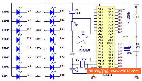 本電路采用16只LED作為畫面每一列的顯示,左右搖晃起到了掃描的作用,人眼的視覺暫留現象使得看到的是一幅完整畫面,與LED點陣的顯示相仿。電路中AT89S51單片機為控制器,在它的P0、P2口接有16只以共陽的方式連接的高亮度LED,由單片機輸出低電平點亮。S1為滾珠開關,棒在搖動時,只能在朝某一方向搖動時顯示,否則會出現鏡像字或鏡像畫面,所以通過接一只滾珠開關來控制,使搖搖棒從左向右搖動時將內容顯示出來;S2是畫面切換開關,單片機中已經寫入能顯示多個畫面的程序,工作時通過這個開關來切換。