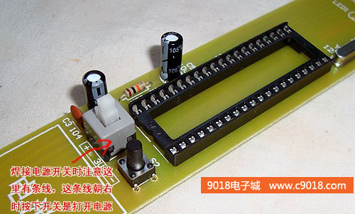 4、焊接40P的IC座,緊接著焊接電解電容、電源開關和畫面切換開關