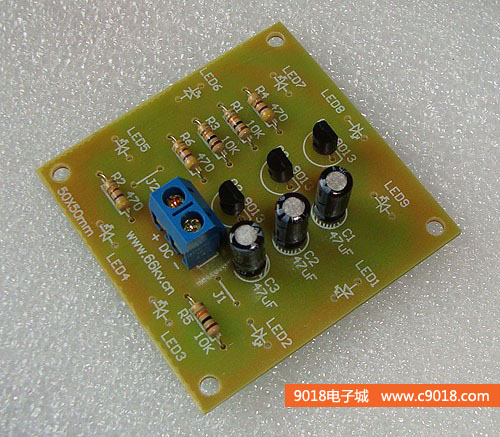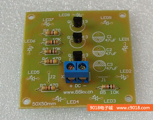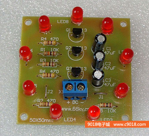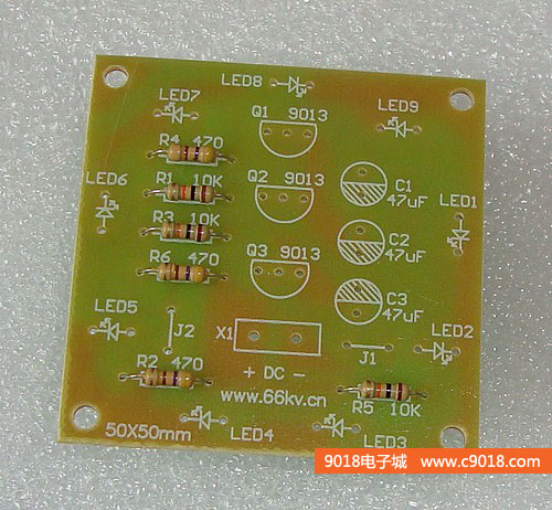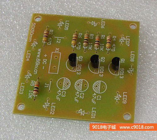 7、最后焊接LED,LED也要注意極性,一般長的引腳為正極,如果直觀不能確定極性可以使用萬用表測量。到這里這個三組9只LED旋轉燈套件就焊接好了