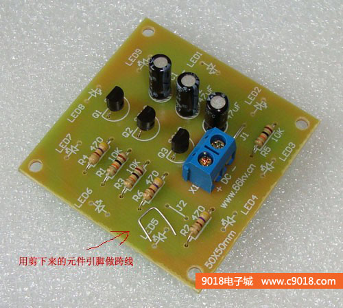 6、焊接跨線,套件中不提供跨線,用剪下的元件引腳做跨線