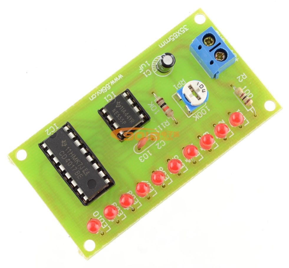 改變RP1大小可改變振蕩周期,即燈組流動速度。當第一個脈沖到來時,Q0輸出高電平,LED1點亮,第二個脈沖到來時,Q1輸出高電平,LED2點亮...直到Q9輸出高電平,LED10亮。完成一個循環輸出,接著進行下一輪輸出,由LED1亮,LED2亮...。