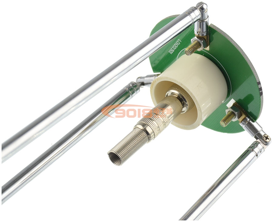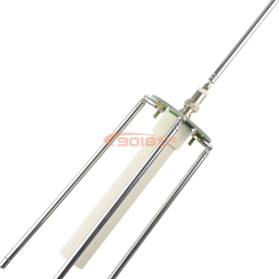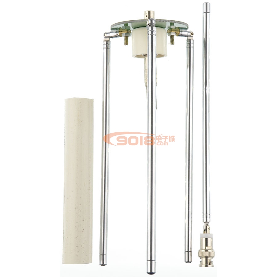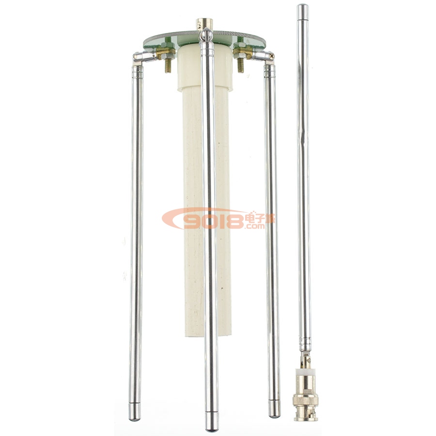 更加高效靈活的調頻發(fā)射天線--GP天線:該天線外觀如圖,是一種發(fā)射效率較高的調頻發(fā)射天線,可置室內,也可放置室外,還可懸掛在空中,其各振子可根據發(fā)射頻率進行收拉,比起目前市售的固定長度振子的GP天線更具靈活性,使其更有效地和發(fā)射機的發(fā)射頻率產生諧振,實現(xiàn)更高的發(fā)射效率; 四根振子的長度均為1.1米可伸縮,適合更寬的發(fā)射頻率調整(理論上可以覆蓋67-375MHz)。 對于不同的發(fā)射頻率,每根振子拉出的長度為(300/頻率)/4(米),中間那根向上拉出,周圍四根向下傾斜45度拉出。比如發(fā)射頻率為107.3MHZ,那么每根振子得拉:(300/107.3)/4=0.699米,當你感覺自己的調頻發(fā)射機的發(fā)射距離不盡人意,接上此天線可起到立竿見影的效果。該天線可與本站的任何一款調頻發(fā)射板配合使用。配套固定手柄,含Q9頭(即BNC頭),不配套同軸電纜傳輸線,天線底部為Q9(BNC)插座,用Q9頭接上同軸電纜的一頭后與天線底部的Q9座旋緊,同軸電纜的另一頭用什么接頭由用戶根據發(fā)射機接口自行決定。