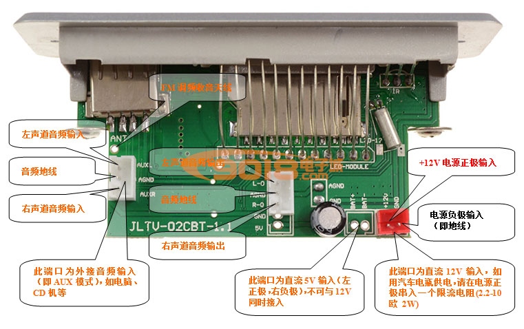特別說明:本品電源供電為直流5V或12V(默認接口為DC12V),可支持MP3/WMA/無損WAV格式。因本品不帶音頻功放,音頻輸出信號只能驅動耳塞式耳機。可以與功放板音頻輸入相接以放大音效。