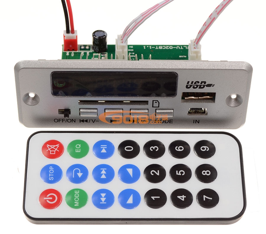 本套件采用優質數字解碼芯片,可直接播放MP3、WMA、WAV文件,帶FM調頻收音、及外接音頻信號輸入端口功能,音質優美,配面板和紅外遙控器,支持USB/SD/MMC卡播放。可以選擇EQ音效:正常、古典、音樂廳、爵士、搖滾、軟搖滾。支持斷電記憶,上一曲,下一曲,播放/暫停等功能,可直接數字選曲。