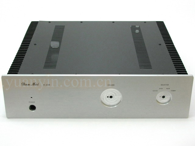 功放機殼 AV238帶散熱合并式機箱AV238合并式機箱面板顏色:金色/鈦銀色面板::電源按鈕/音量/信號選擇 面板為高密度鋁合金,開好孔和絲印,發(fā)燒級機型,工藝細致。外部尺寸:420×高105×深390mm內部尺寸:358×高102×深380mm散熱尺寸:寬190×高100×厚30mm 共4塊 配齊:電源開關、旋鈕、RCA排座、重量級接線柱、電源插座、保險座等外圍配件。
