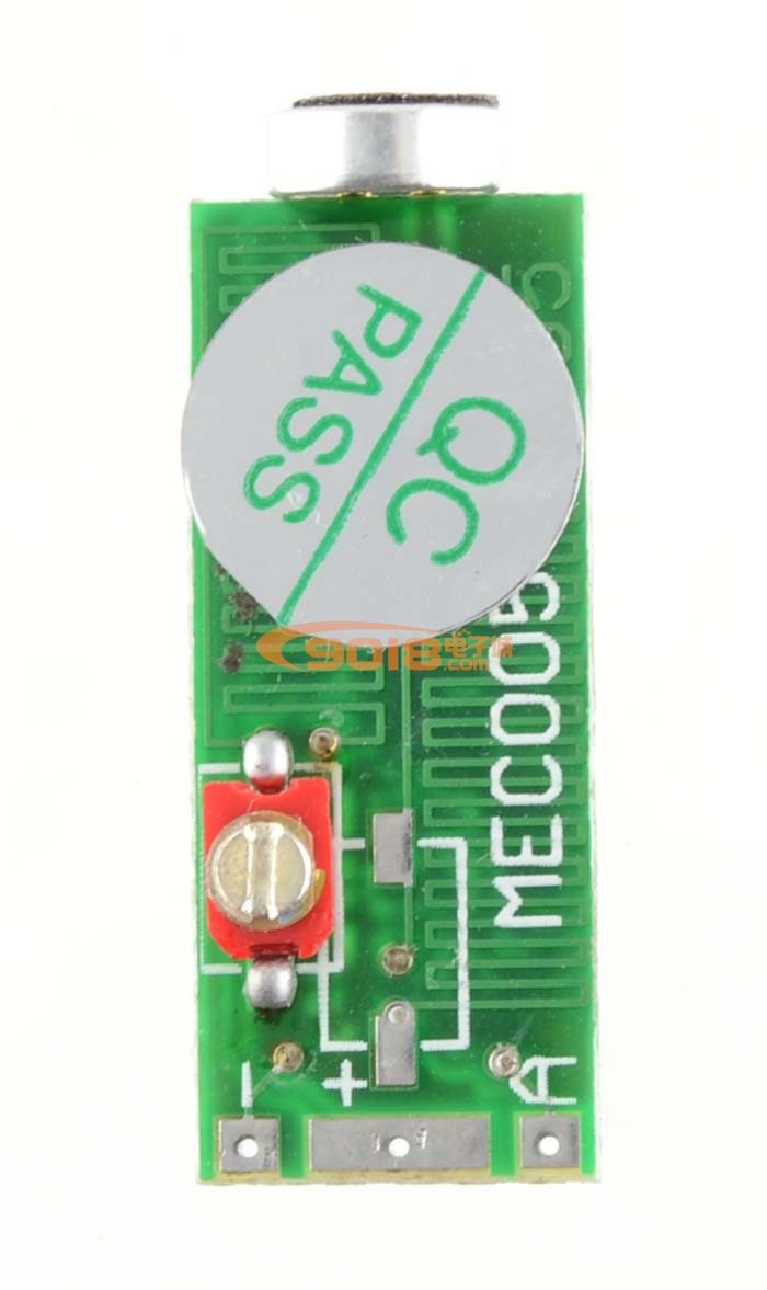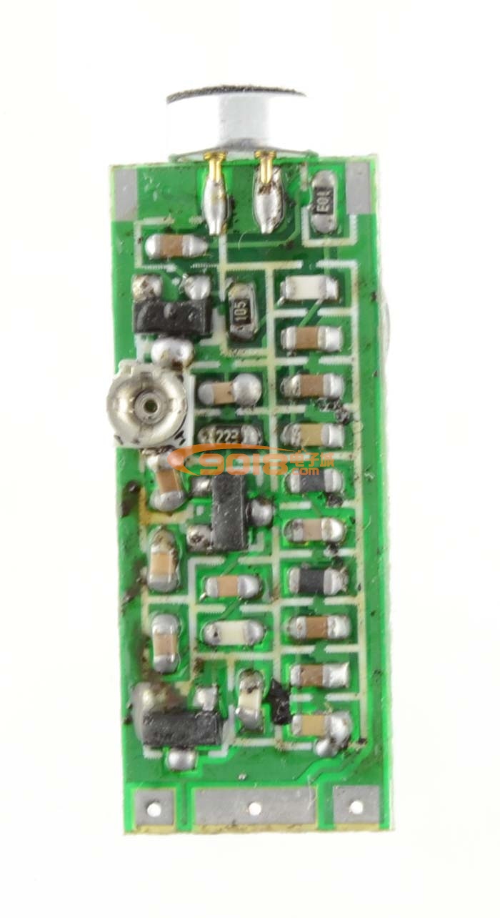 經濟型頻率可調話筒靈敏度可調超微型貼片FM發射片:本模塊為超微型調頻無線話筒模塊,買家需自己焊接電源和天線。本模塊會因人體感應而產生頻率漂移,即扔著一處不去動它,不適合手持。外型尺寸含話筒為:27X10X6mm,工作電壓1.5-6V,對應工作電流約10-40 mA,采用室外GP天線發射其參考發射距離在開闊環境下約為10-500米。電壓越高發射距離越遠但耗電也越大,最佳工作電壓為3-5V,3V時工作電流只有約15mA,耗電很小。6V不可使用單節疊層電池或其它類似的小功率電池供電,很快就會沒電。該電路由話筒放大+高頻振蕩+射頻放大構成,全貼片分離元件無集成電路,工作頻率相對穩定,會因電壓變化或人體感應產生輕微頻漂,使用時建議增加穩壓電路及在A與天線間串聯20P以下小電容有利于穩定頻率,串聯電容會相對減短發射距離。本模塊話筒靈敏度極高,可聽到30平米房間內的腳步聲。通電即可發射,發射天線可選用軟導線或拉桿天線,天線的長度高度和效率直接關系到發射距離,可視實際使用需要而定,建議天線長度約為75cm。模塊裝入金屬外殼時天線應留出在金屬外殼外,否則發射距離會嚴重減短。本模塊發射頻率可調,可調范圍約為98-115MHZ,如調在98-108內,可用普通調頻收音機接收;如調在108-115MHZ內,普通調頻收音機收不到。調節背面貼片可調電容可改變發射頻率。本模塊還帶有微型貼片電位器可用于調節麥克風感應聲音的靈敏度。