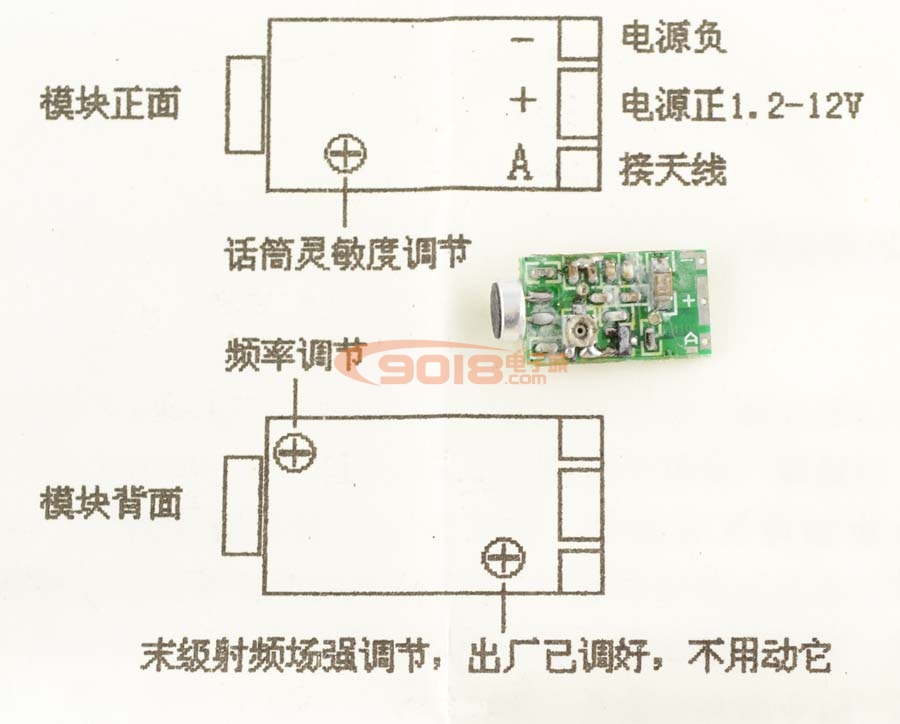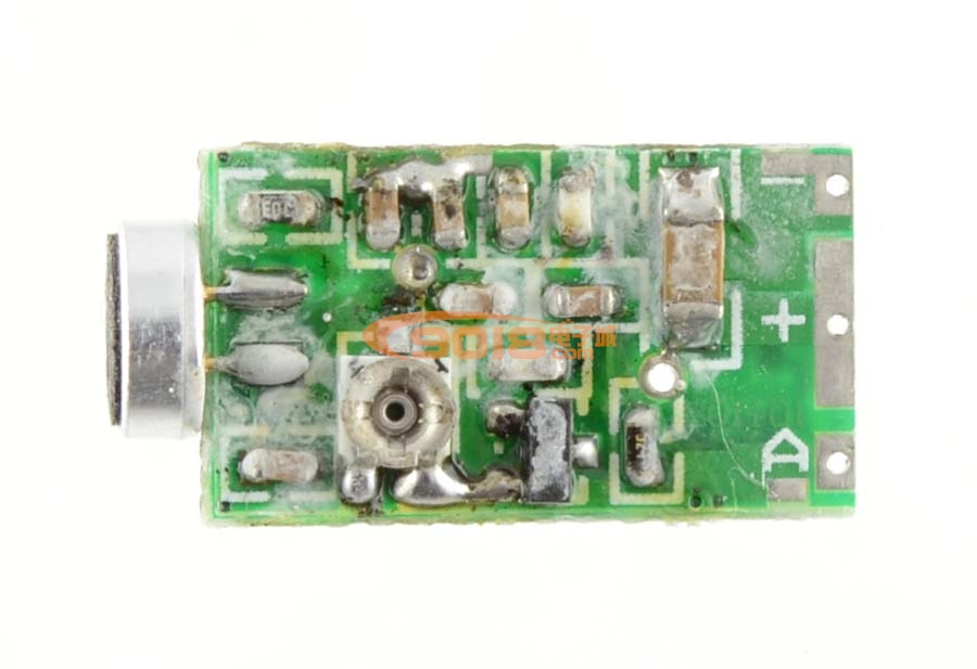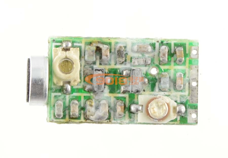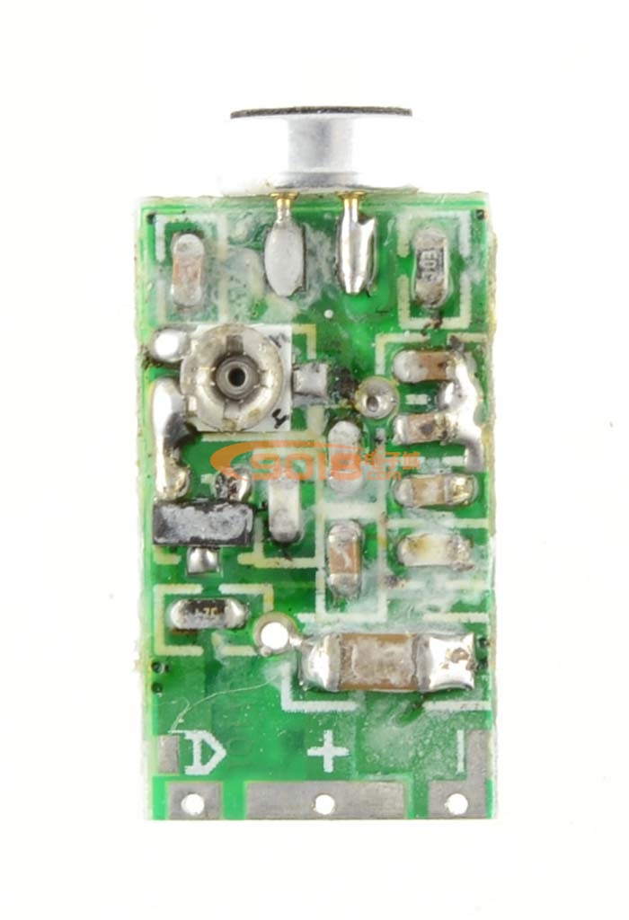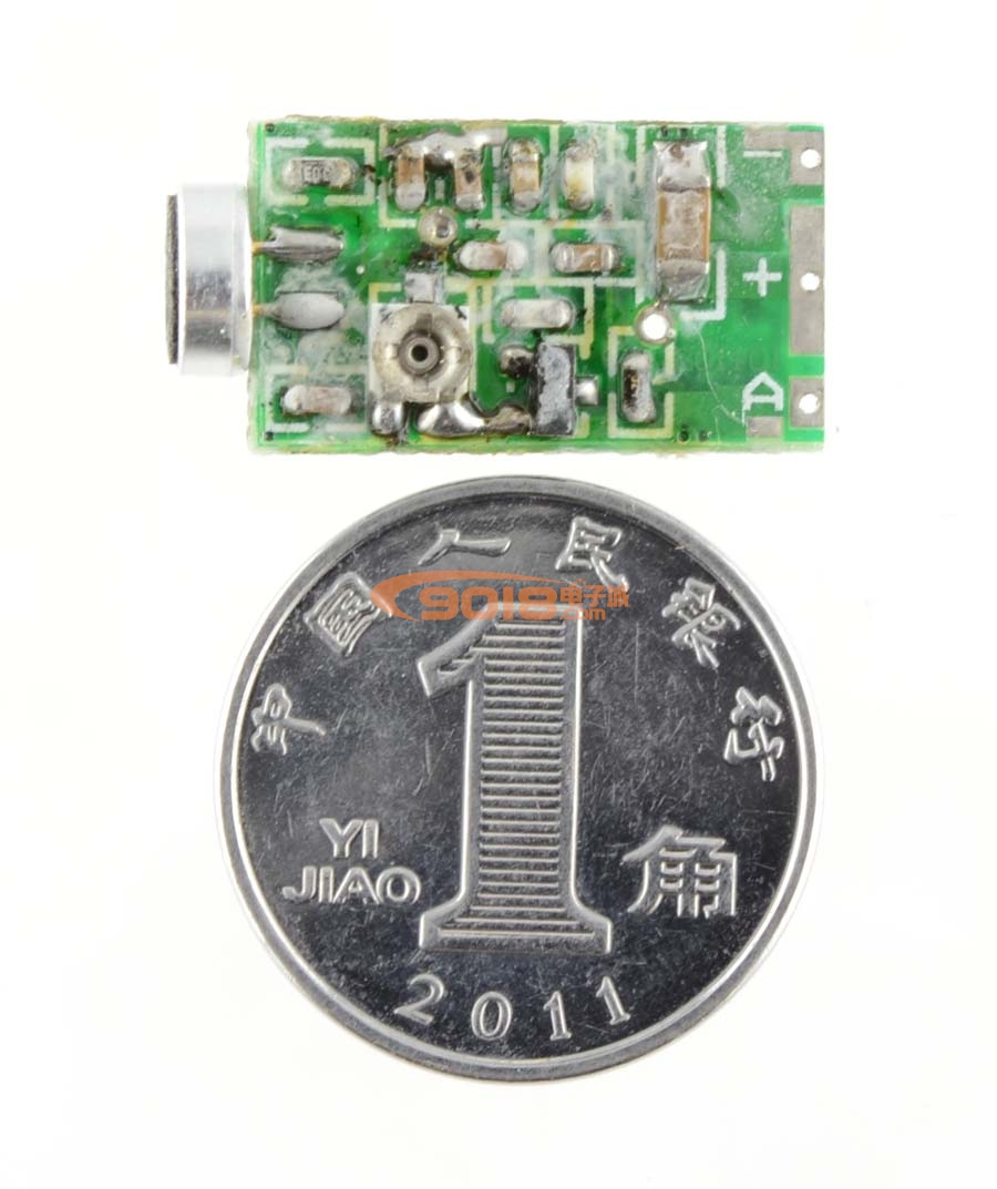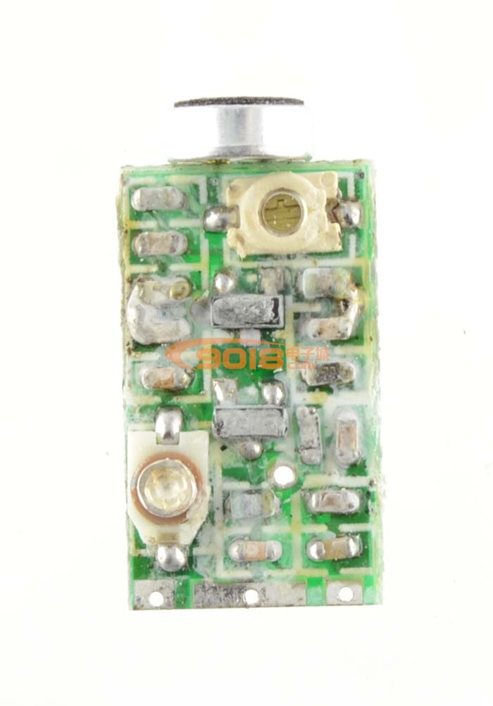 穩定型頻率可調話筒靈敏度可調超微型貼片FM發射片:本模塊為超微型調頻無線話筒模塊,買家需自己焊接電源和天線。外型尺寸含話筒為:20X10X6mm,工作電壓1-12V,對應工作電流約5-40 mA,3V(10mA),6V(20mA),9V(30mA),12V(40mA),耗電非常小但很高效,采用室外GP天線發射其參考發射距離在開闊環境下約為10-500米。電壓越高發射距離越遠但耗電也越大,最佳工作電壓為3-6V。該電路由話筒放大+高頻振蕩+射頻放大構成,除麥克風外全貼片元件電路,工作頻率很穩定,3-6V內工作電壓變化對其頻率穩定度影響非常小,因人體感應產生的頻漂亦非常小。本模塊話筒靈敏度極高且可調。通電即可發射,發射天線可選用軟導線或拉桿天線,天線的長度高度和效率直接關系到發射距離,建議天線長度為75cm。模塊裝入金屬外殼時天線應留出在金屬外殼外,否則發射距離會嚴重減短。本模塊發射頻率可調,默認可調范圍約為100-115MHz,如果調在100-108MHz內,可用普通調頻收音機接收。