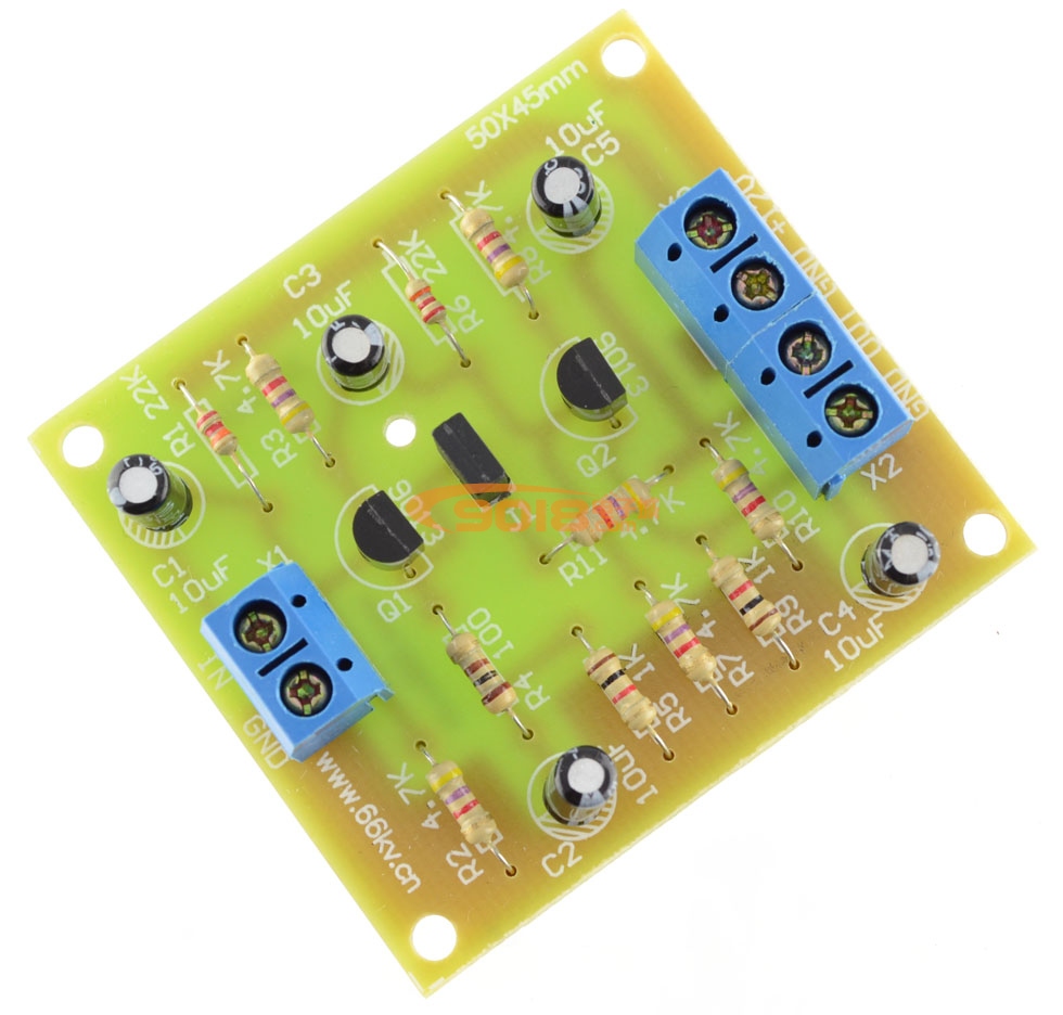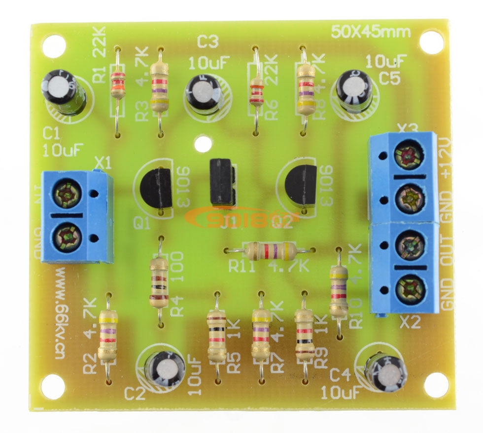 本套件是由兩個(gè)三極管組成的負(fù)反饋的放大電路。電路中Q1、Q2是兩個(gè)起放大作用的NPN型小功率三極管,R1—R9是它們的直流偏置電阻;R10是電路的負(fù)載電阻;R11是負(fù)反饋電阻,他的大小直接影響負(fù)反饋的強(qiáng)弱;C1、C3、C5是耦合電容;C2、C4是射極電阻旁路電容,提供交流信號(hào)的通道,減小放大過程中的損耗,使交流信號(hào)不因射極電阻的存在而降低放大器的放大能力;J1是一個(gè)短路線,用來測(cè)試有無負(fù)反饋時(shí)輸出信號(hào)的變化;X1、X2、X3分別是信號(hào)輸入、信號(hào)輸出和電源輸入。電源電壓為12V直流,輸入信號(hào)可以采用1KHz/2mV正弦波信號(hào)源,輸出端接示波器,觀察輸出波形。