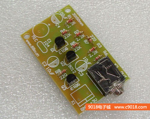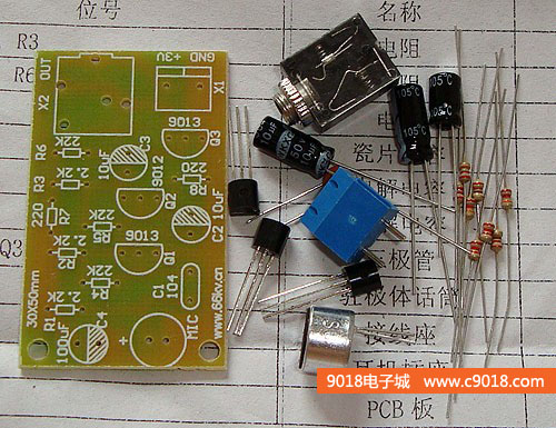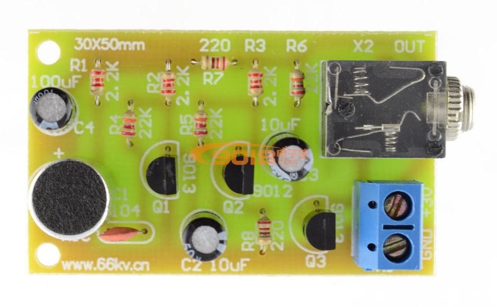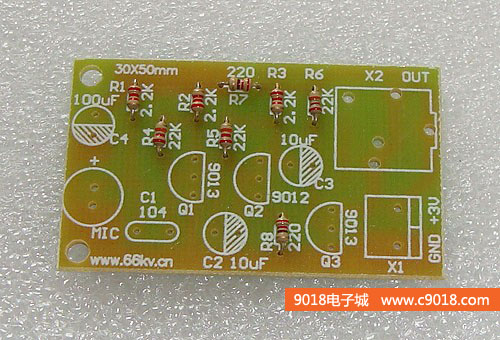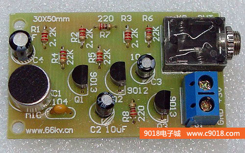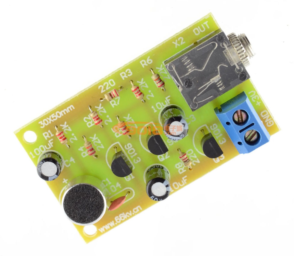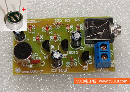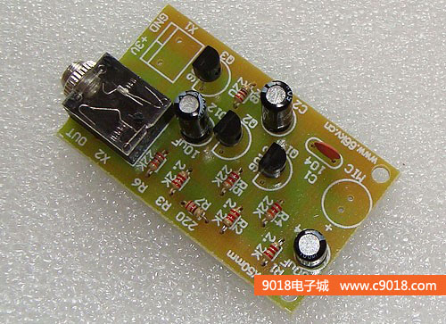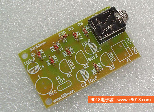 7、到這里多級放大器套件就焊好了。裝上電源和耳機進行測試,對著駐極體話筒說話,耳機里能聽到宏亮的聲音