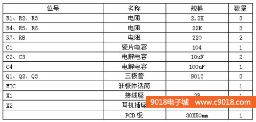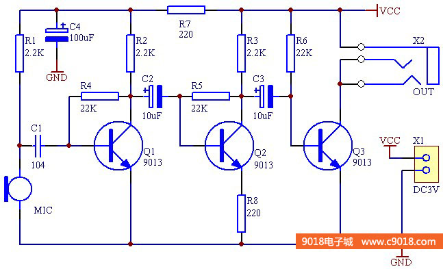 本電路由Q1、Q2、Q3組成三級音頻放大電路,級與級之間采用電容耦合方式連接。前兩級是一種具有電壓負反饋的偏置電路,能起到穩定工作點的作用。MIC是駐極體話筒,微弱的聲音信號由話筒變成電信號,經過音頻放大電路的多級放大,最后由耳機插座X2輸出,輸出的信號由外接的耳機或揚聲器發出聲音。