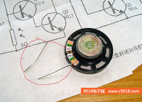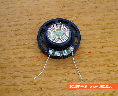 7、這是焊好引線的喇叭,一定要注意引線焊在喇叭接線端的兩端位置上如圖兩個(gè)箭頭所示所示