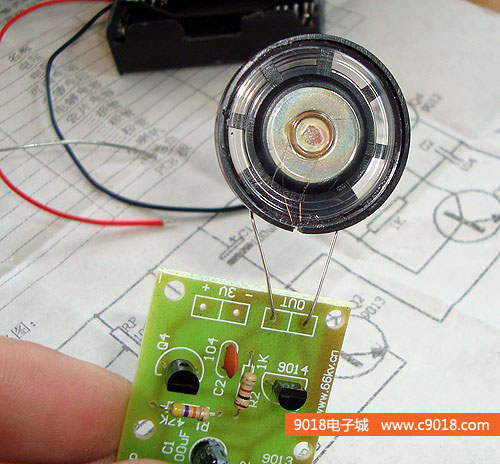 9、把喇叭引線焊接在熄火報(bào)警器電路板的OUT端,不用考慮正負(fù)極