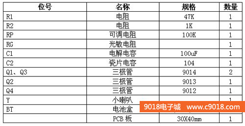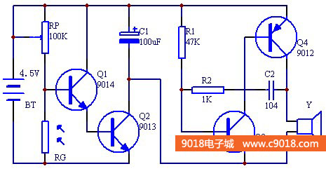 RG、Q1、Q2組成光控開關(guān);當(dāng)爐火燃燒時(shí)光敏電阻RG受到強(qiáng)烈的光照,內(nèi)阻很小,Q1、Q2均截止,由Q3、Q4組成的報(bào)警電路不工作;當(dāng)爐火熄滅時(shí),光照基本消失,光敏電阻內(nèi)阻增大,致使Q1、Q2導(dǎo)通,接通了報(bào)警電路的電源,揚(yáng)聲器發(fā)出報(bào)警聲;調(diào)節(jié)可調(diào)電阻RP可獲得合適的報(bào)警靈敏度。