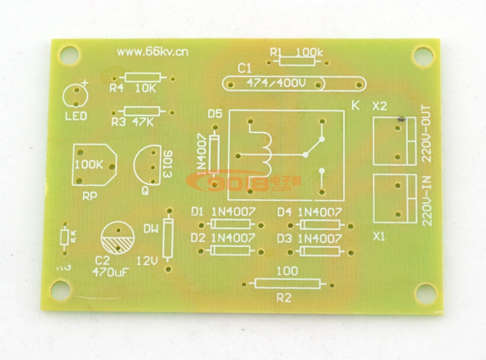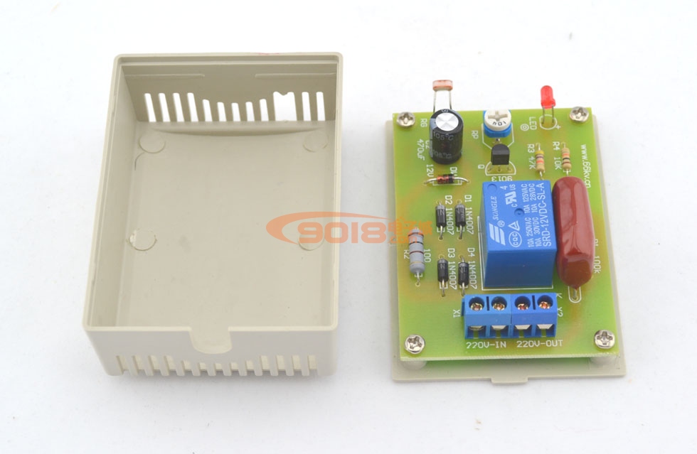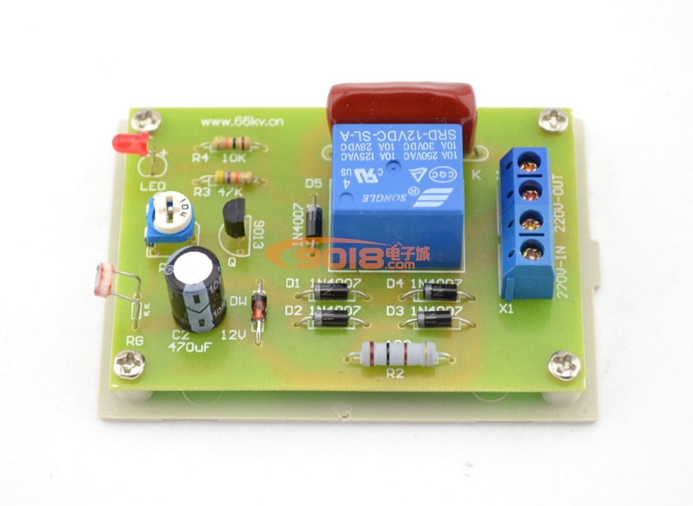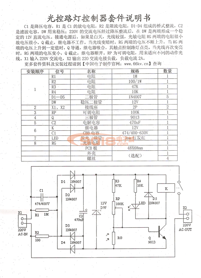 C1是降壓電容,R1是C1的放電電阻,R2是限流電阻,D1-D4組成的橋式整流,C2是濾波電容,DW用來穩壓;220V的交流電壓經過降壓整流后,在DW是兩端形成一個穩定的12V直流電壓。接通電源后,如果是白天,光線較強,光敏電阻RG兩端的電阻很小故電壓很小,Q截止,繼電器不工作。當光線變暗時,RG兩端的電壓不斷上升,當RG兩端的電壓上升到一定值時,Q導通,繼電器吸合,其觸點控制路燈點亮。當光線再次變亮時,RG兩端的電壓變小,Q截止,繼電器斷開。RP為可調電阻,用來適應不同的動作光線。X1輸入220V交流電,X2輸出220交流電接負載,負載電流2A