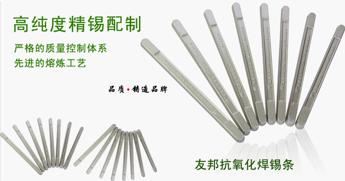 友邦公司生產(chǎn)的各種合金成份的錫鉛焊錫條均符合GB/T8012—2000標(biāo)準(zhǔn)規(guī)范。“友邦”牌抗氧化型焊錫條全部采用了高純度精錫配制,在嚴(yán)格的質(zhì)量控制體系及先進(jìn)的熔煉工藝下有效控制了該產(chǎn)品的有害雜質(zhì),如:銅、鎘、硫、鋅、鋁、鐵、和氧化物的含量,從真正意義上確保您獲得優(yōu)良而可靠的焊點(diǎn)。